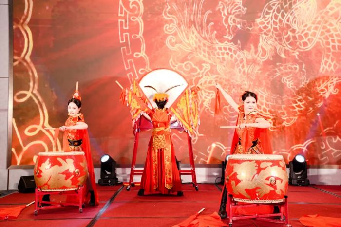 年会在激昂的鼓声中拉开帷幕。鼓手们挥舞鼓槌,密集的鼓点如暴风骤雨倾泻而下,磅礴气势瞬间抓住众人目光,点燃现场热烈氛围。紧接着,欢腾舞狮隆重登场,瑞狮灵动活泼,时而昂首摆尾,时而上下翻腾,将祥瑞与欢乐传递给现场每一位朋友。